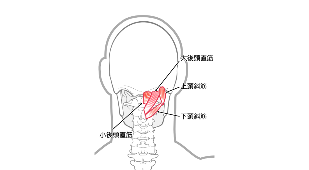 後頭下筋群は、後頭骨と上部頸椎の間にある4つの小さな深層筋群で、頭の位置の微調整を行います。長時間のパソコン作業やスマートフォンの使用による眼精疲労、頭部の前方移動により常に緊張し、後頭部や目の奥の頭痛と関連が深いです。
