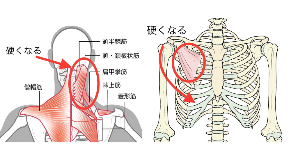 これらの筋肉は、不良姿勢によって常に緊張を強いられたり、逆に十分に使われずに弱くなったりすることで、柔軟性を失い硬くなります。